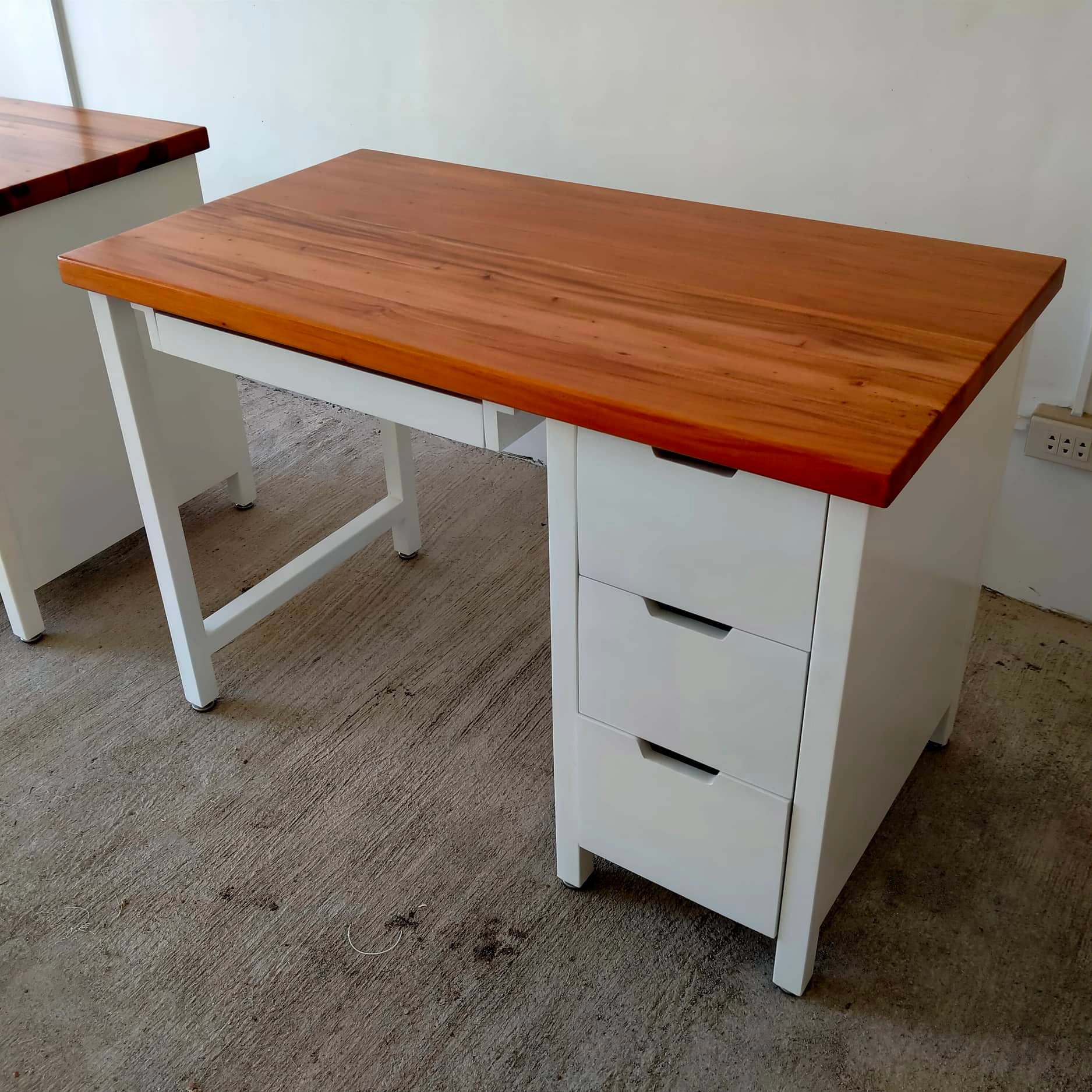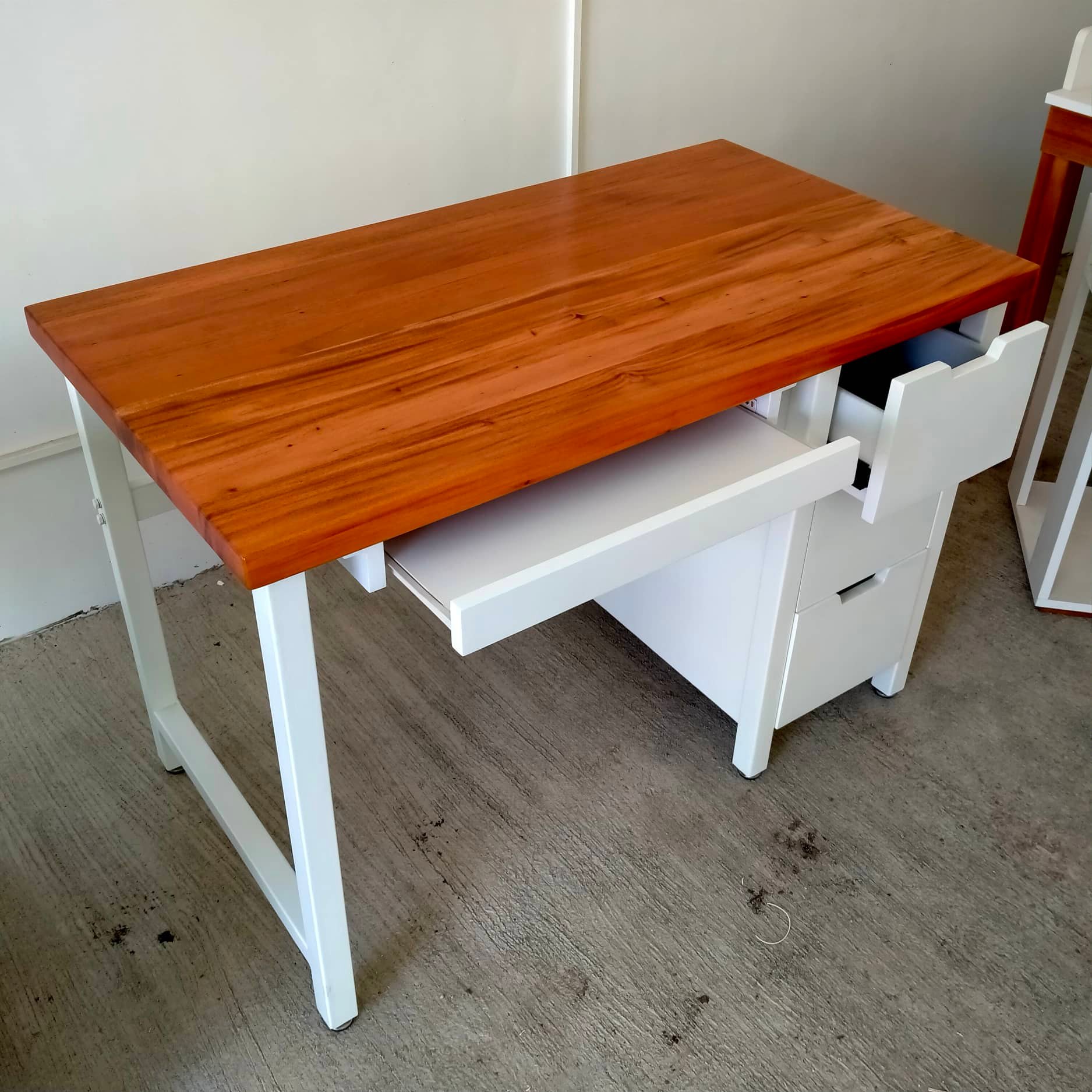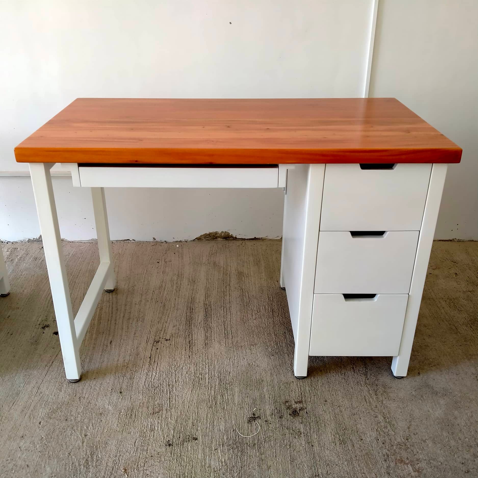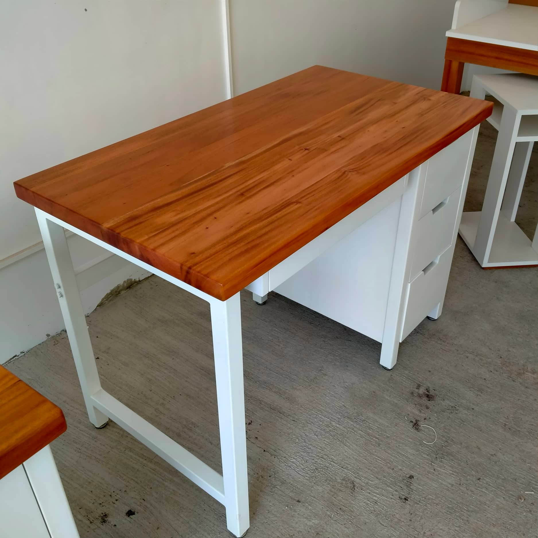 2units for delivery to Carcar. Computer table with drawers and sliding keyboard painted white, topped with solid mahogany wood block in natural glossy finish. To order, send us a message or call us! 📞0917-311-0566